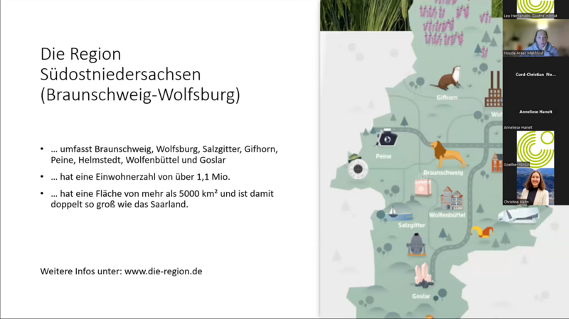 Im Bild rechts ist ein Screenshot der Präsentation unserer Region durch unsere Kollegin Houda Araar-Makhlouf zu sehen.